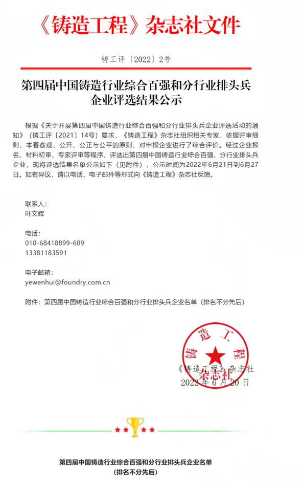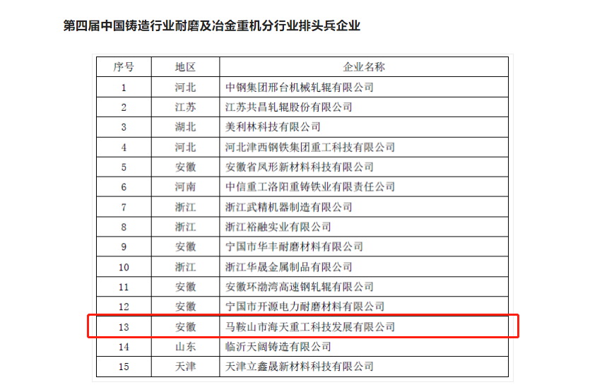 根據(jù)《關(guān)于開展第四屆中國鑄造行業(yè)綜合百強和分行業(yè)排頭兵企業(yè)評選活動的通知》(鑄工評〔2021〕14號)要求,《鑄造工程》雜志社組織相關(guān)專家,依據(jù)評審細則,本著客觀、公開、公正與公平的原則,對申報企業(yè)進行了綜合評價。經(jīng)過企業(yè)報名、材料初審、專家評審等程序,評選出第四屆中國鑄造行業(yè)綜合百強、分行業(yè)排頭兵企業(yè)。海天重工被評選為“第四屆中國鑄造行業(yè)耐磨及冶金重機分行業(yè)排頭兵企業(yè)“,這是海天重工獲得的象征行業(yè)地位的又一個標志性榮譽。